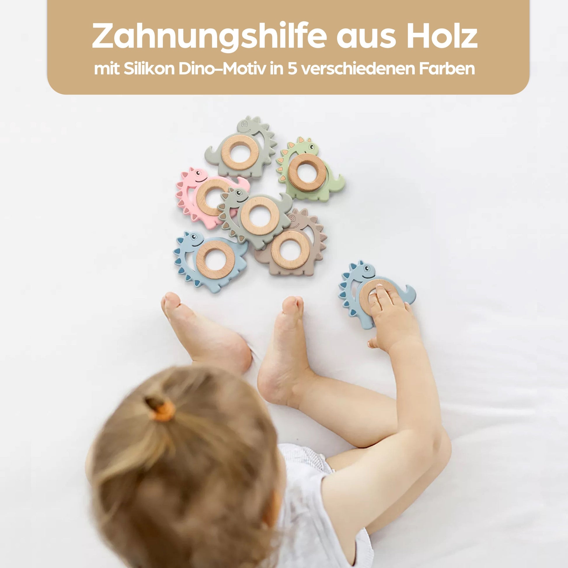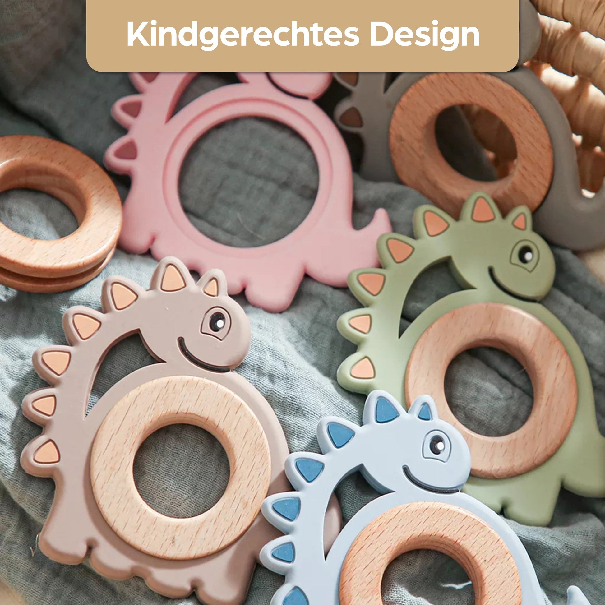 Dinosaurier Beißring für Babys aus Natur Holz und Silikonform in Pink
